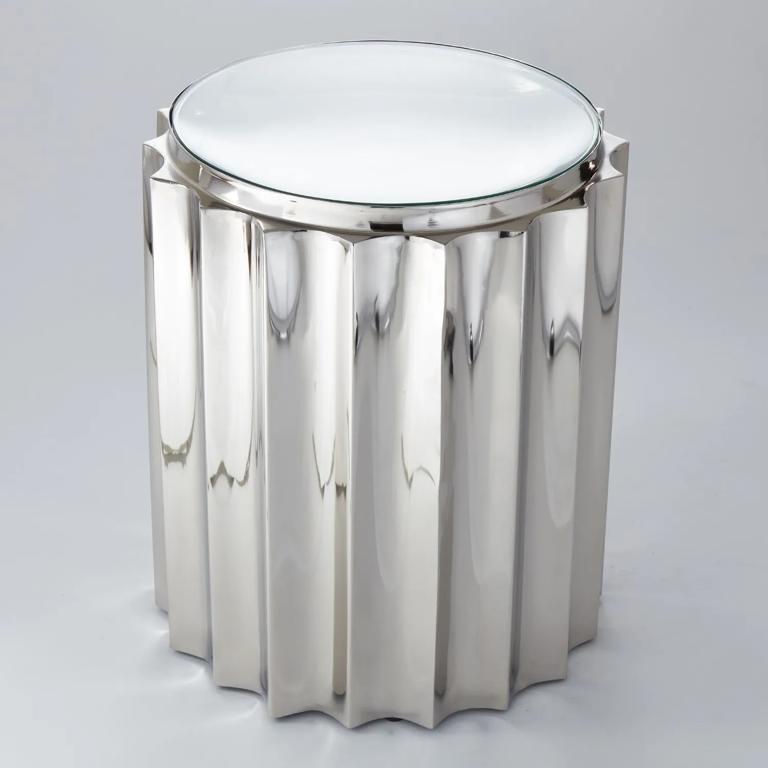 A contemporary spin on a classic fluted Greek column. The top surface is concave with a flat inset tempered glass top. Chrome plated iron.
