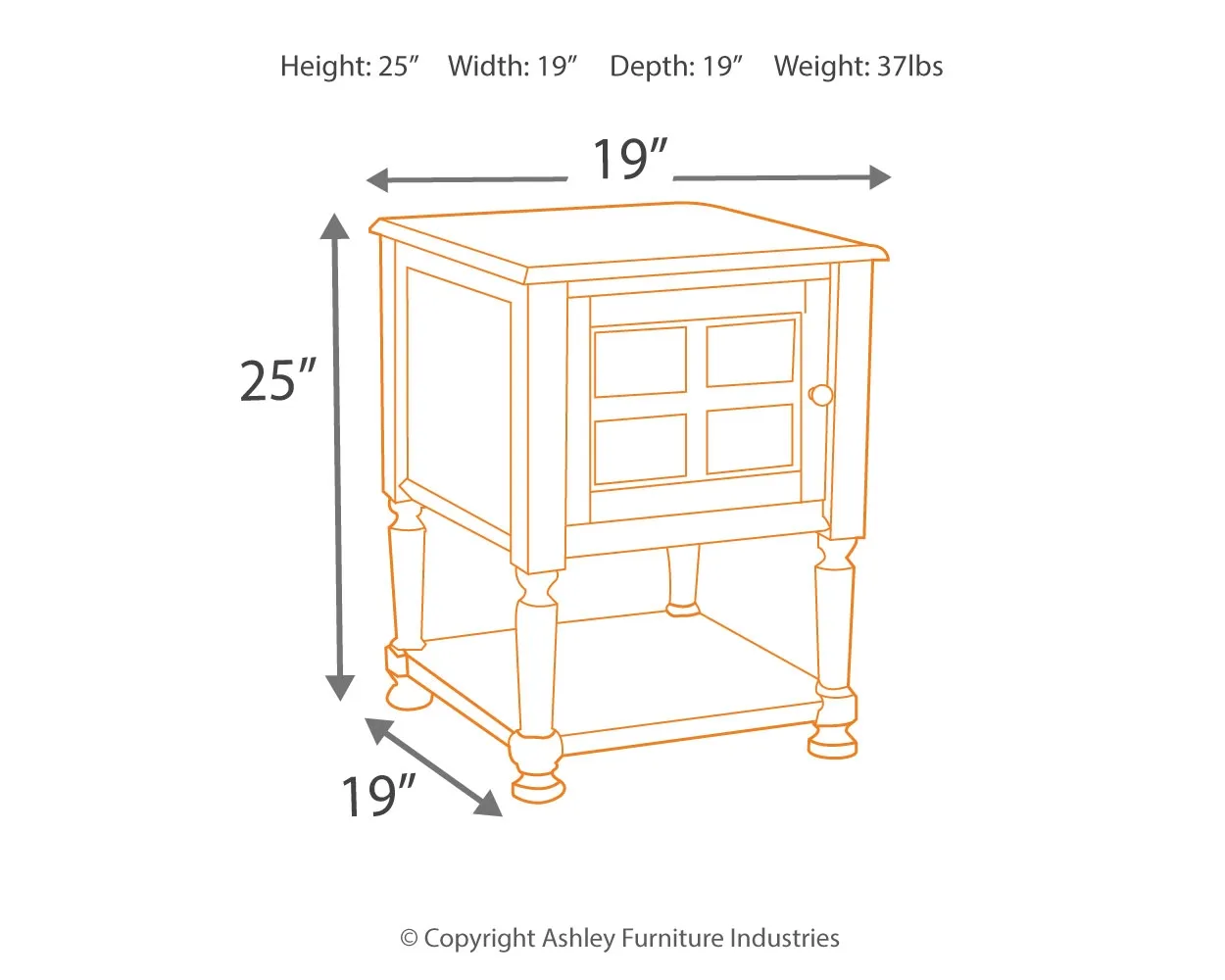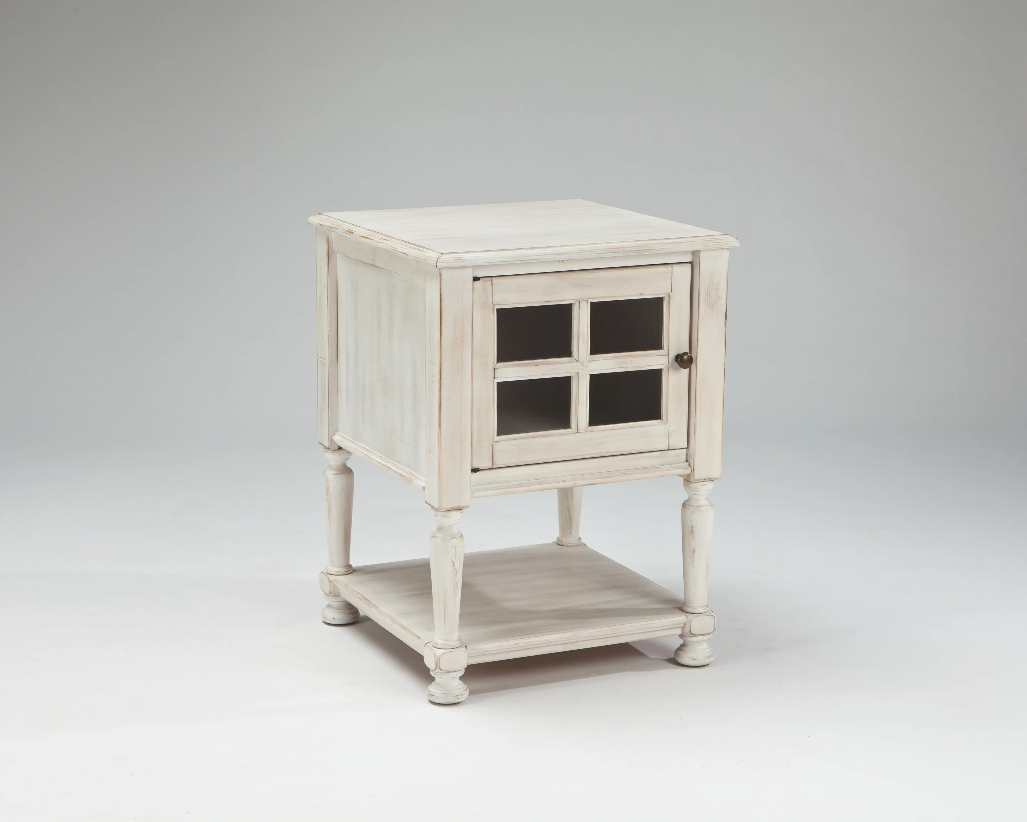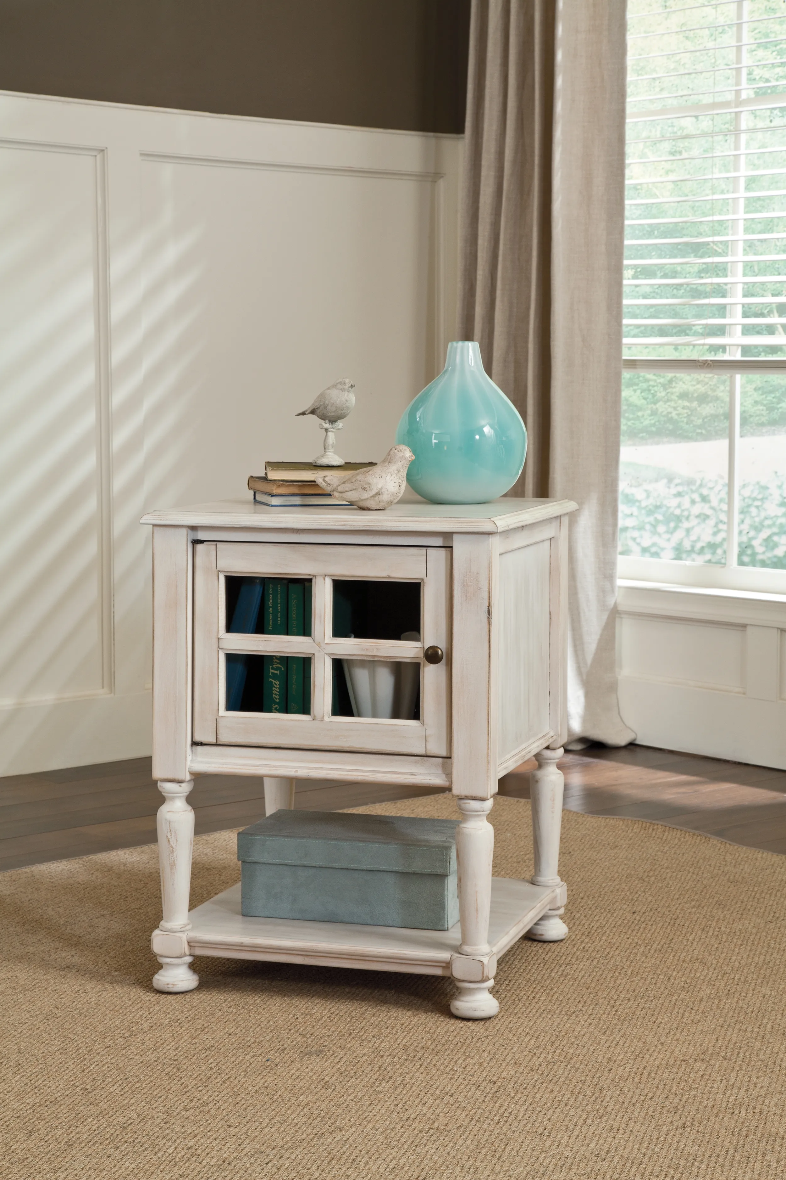 Darned if you're not charmed by the adorability of this chairside end table. The cabinet space provides a sweet place to tuck away everything from current reads to treasured mementos. Window panes let you get creative when it comes to your displays. A distressed finish includes gentle rubbed-through treatment for a lovely antiqued effect.