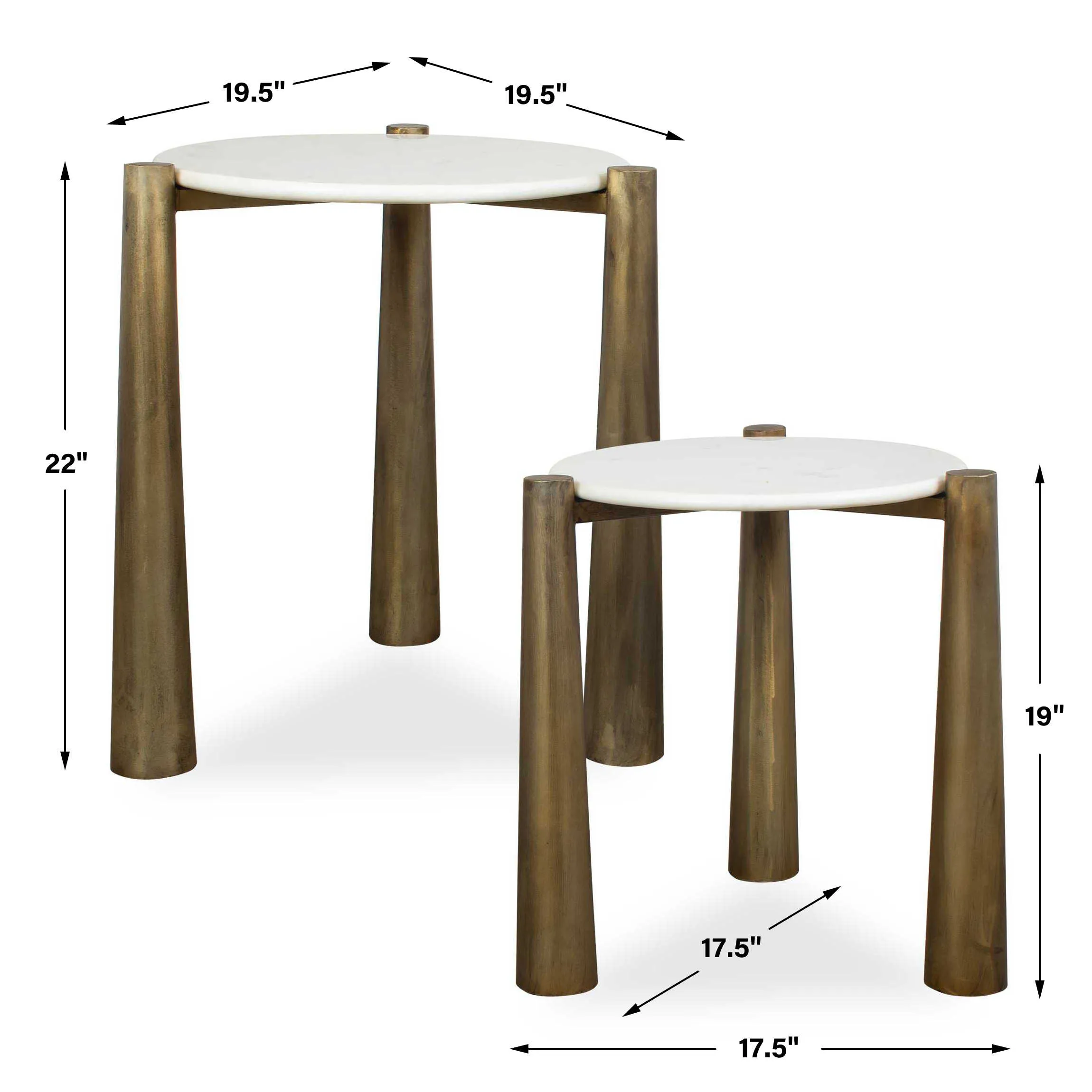 This Exquisite Set Of Two Accent Tables Showcases Pristine White Marble Slabs, Veined With Subtle Hints Of Gold And Gray. Each Tabletop Sits Atop A Sophisticated Frame With Gracefully Tapered Legs, Finished In An Antique Gold. True To The Nature Of Natural Materials, Each Piece Will Have Unique Marbling And Veining Throughout.