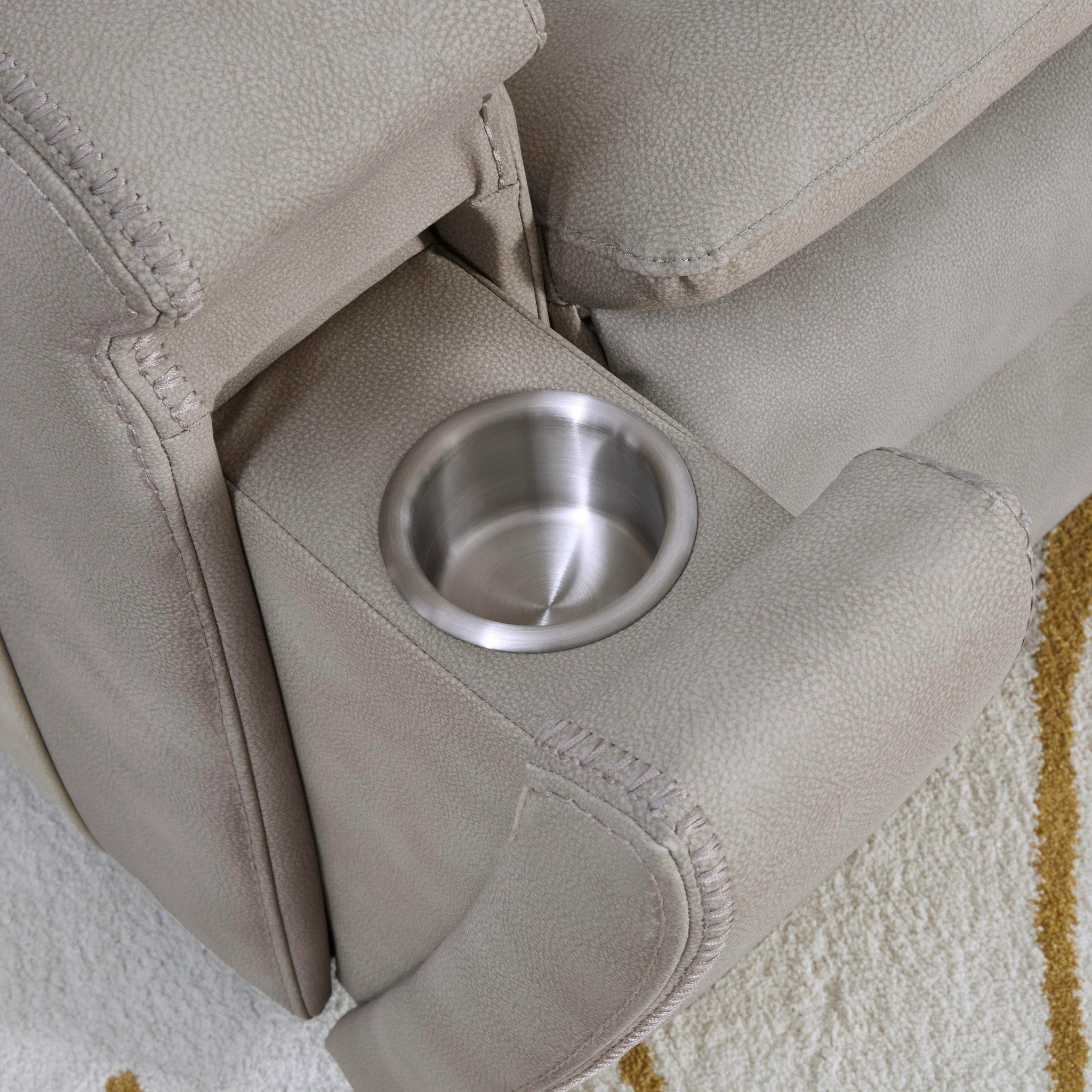 - Hidden tilt stainless steel cup holders in both armrests