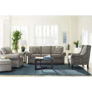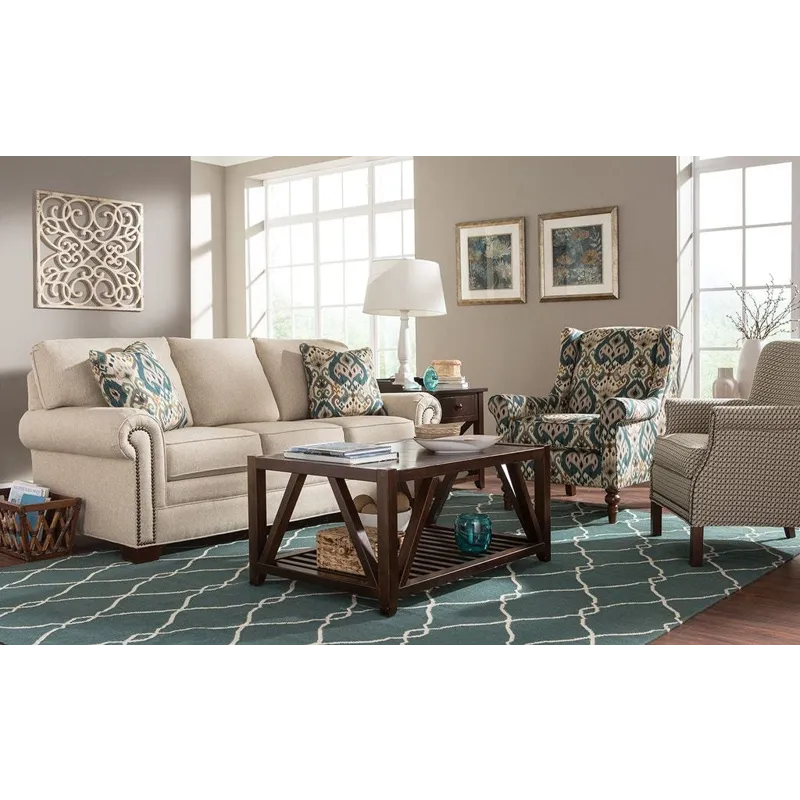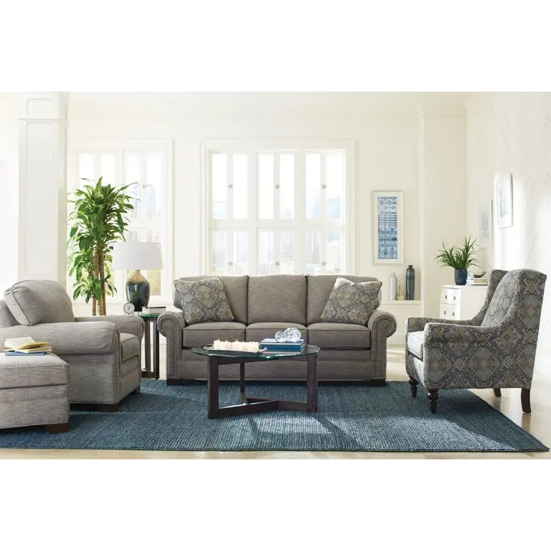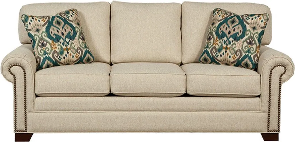 Casual sophistication comes to life in this updated classic sleeper sofa. Dark brass nail heads trim the arm panels and accent the pleated rolled arms- set at the perfect height for a good nap! Three seat cushions and three attached backs provide a plush, comfortable place to relax. Tapered block legs offer a modern touch to this simple, but refined look. Also available are the matching sofa (no sleeper), loveseat, chair and ottoman. Optional nail finishes available.