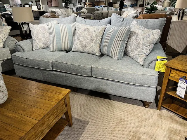 This casual sofa, from the Paula Deen Home collection is one of our favorites, and a best seller too. It's easy to see why! For starters, it's a generous 100'' long and features an armload of pillows to curl up and relax on. The loose pillow backs, roll arms, and turned wood legs give it a laid back, casual look that Paula is so proud of! It also features her exclusive Down Blend cushions that wrap you in comfort from the first moment, but will last for years. This style is also available as a 2 -piece sectional in varying sizes. Also available are the matching loveseat, chair 1/2, ottoman.
