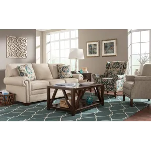 Classic styles bring a welcome, familiar touch to your home and this queen size sleeper sofa does just that. The attached box border backs form a gentle arch across the back, and the shaped arm panels have been smartly trimmed with nail heads. The look is traditional but updated for today's lifestyle. 3 accent pillows. Also available are the matching sofa, loveseat, chair, and ottoman.