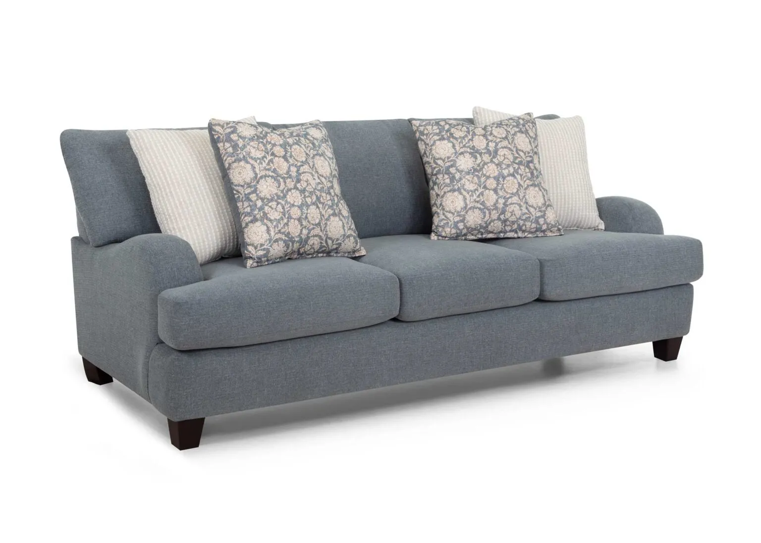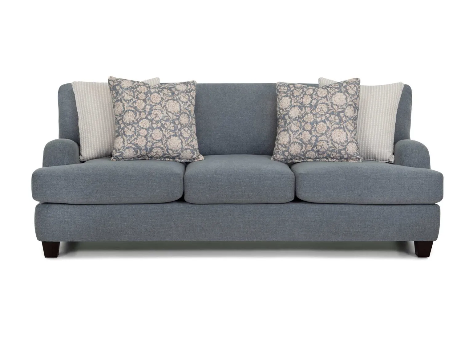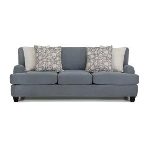 Timeless elegance meets everyday comfort in the 992 Laurel Collection. This inviting collection includes a sofa, loveseat, chair and a half, and a matching ottoman. All pieces upholstered in a durable gray-blue fabric. Coordinating throw pillows in timeless patterns and soothing hues enhance the aesthetic, adding a touch of warmth to the group. Solid wooden legs complete the look and offers support and a polished finish.