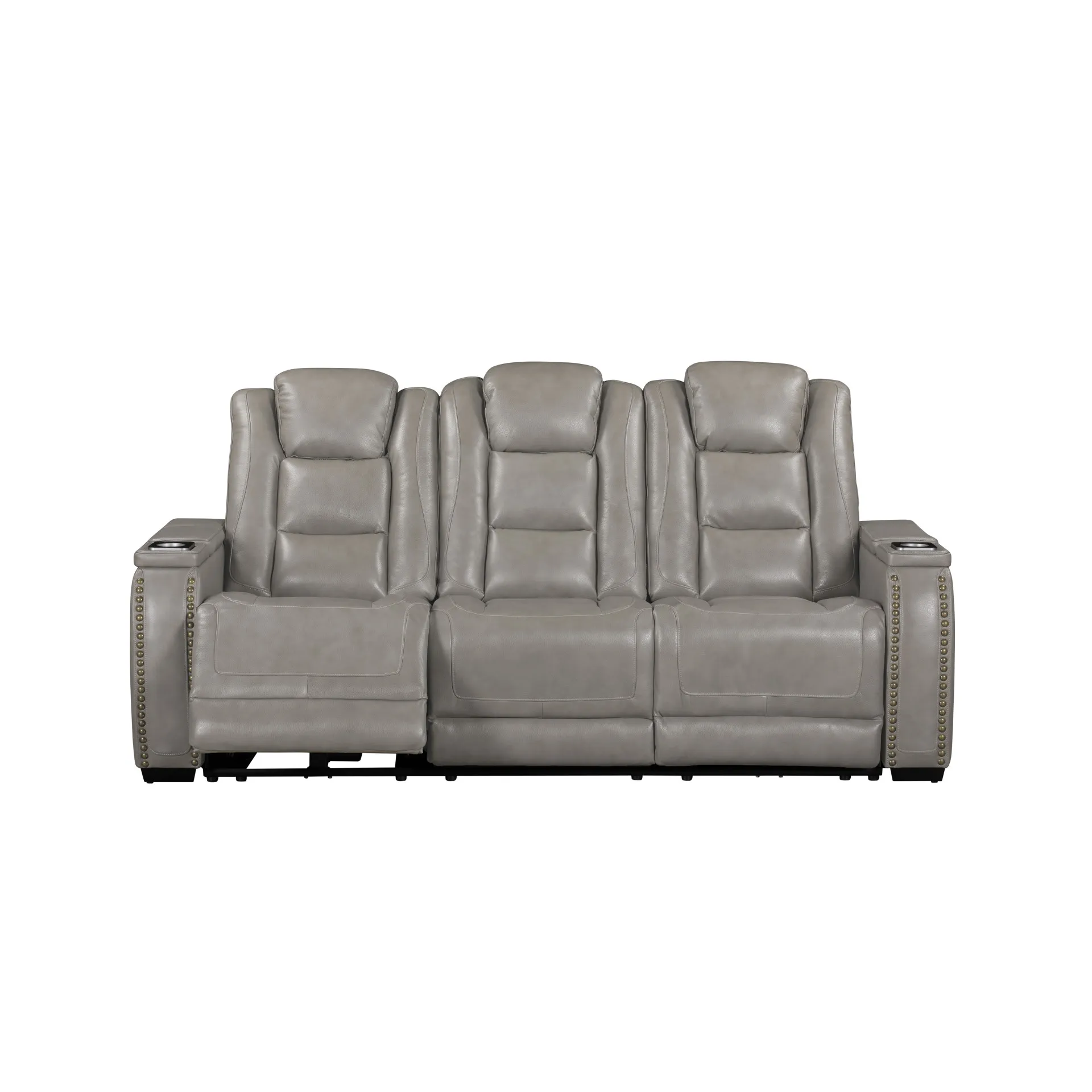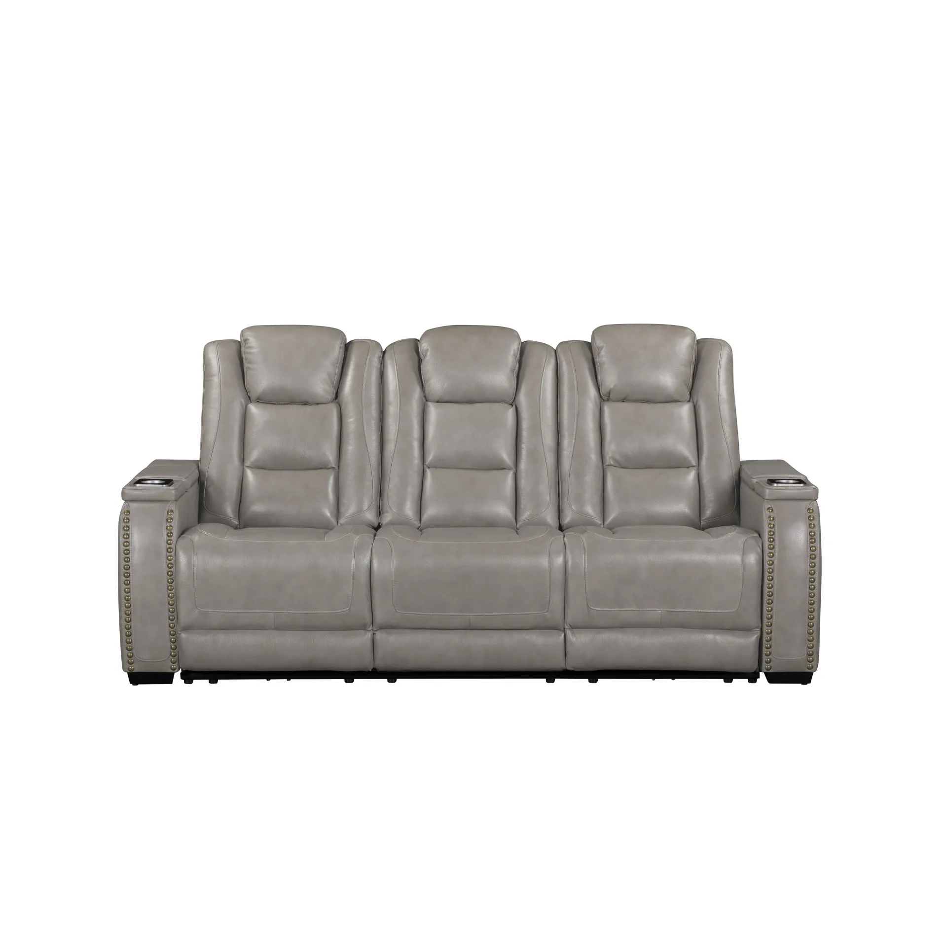 The Breckenridge Genuine Leather Power Reclining Sofa with Adjustable Headrests in Gray offers a blend of luxury, durability, and modern convenience, perfect for any living space. This sofa is crafted with a combination of hardwood and manufactured woods, ensuring a sturdy and durable frame that provides long-lasting support. The top-grain leather on high-contact areas like the seats, arms, and footrests delivers a luxurious feel, while the use of a matching synthetic leather in less-touched areas keeps it more economical without compromising on style or comfort. The design features clean lines and elegant nailhead trim, seamlessly blending traditional and contemporary elements for a refined, transitional look. Pocket coil seat cushions offer superior comfort with targeted support, reducing pressure points for a more tailored seating experience. The power recliner and adjustable headrests allow you to effortlessly find your perfect position for lounging or reading with just the touch of a button. This sofa is also packed with convenient features, including built-in wireless chargers, generous storage compartments, and cupholders integrated into the armrests. Additionally, it includes a drop-down tray, electrical outlets, and reading lights, allowing you to unwind, stay connected, and enjoy your favorite activities without ever leaving your seat.