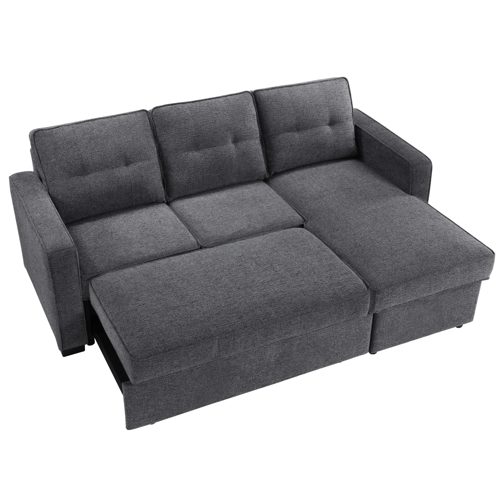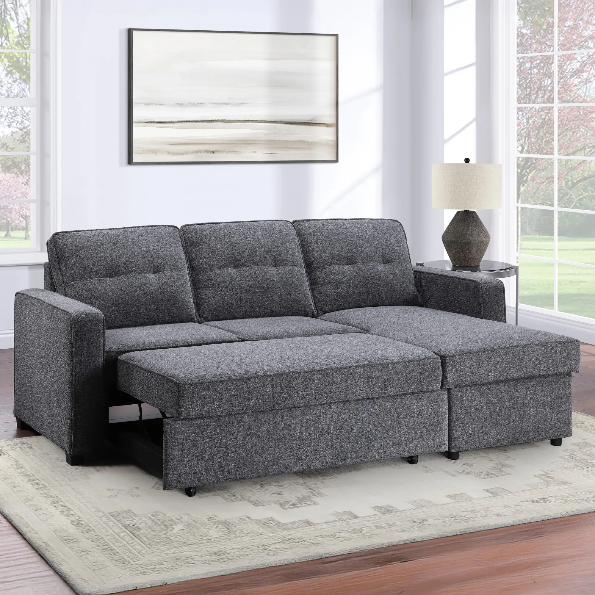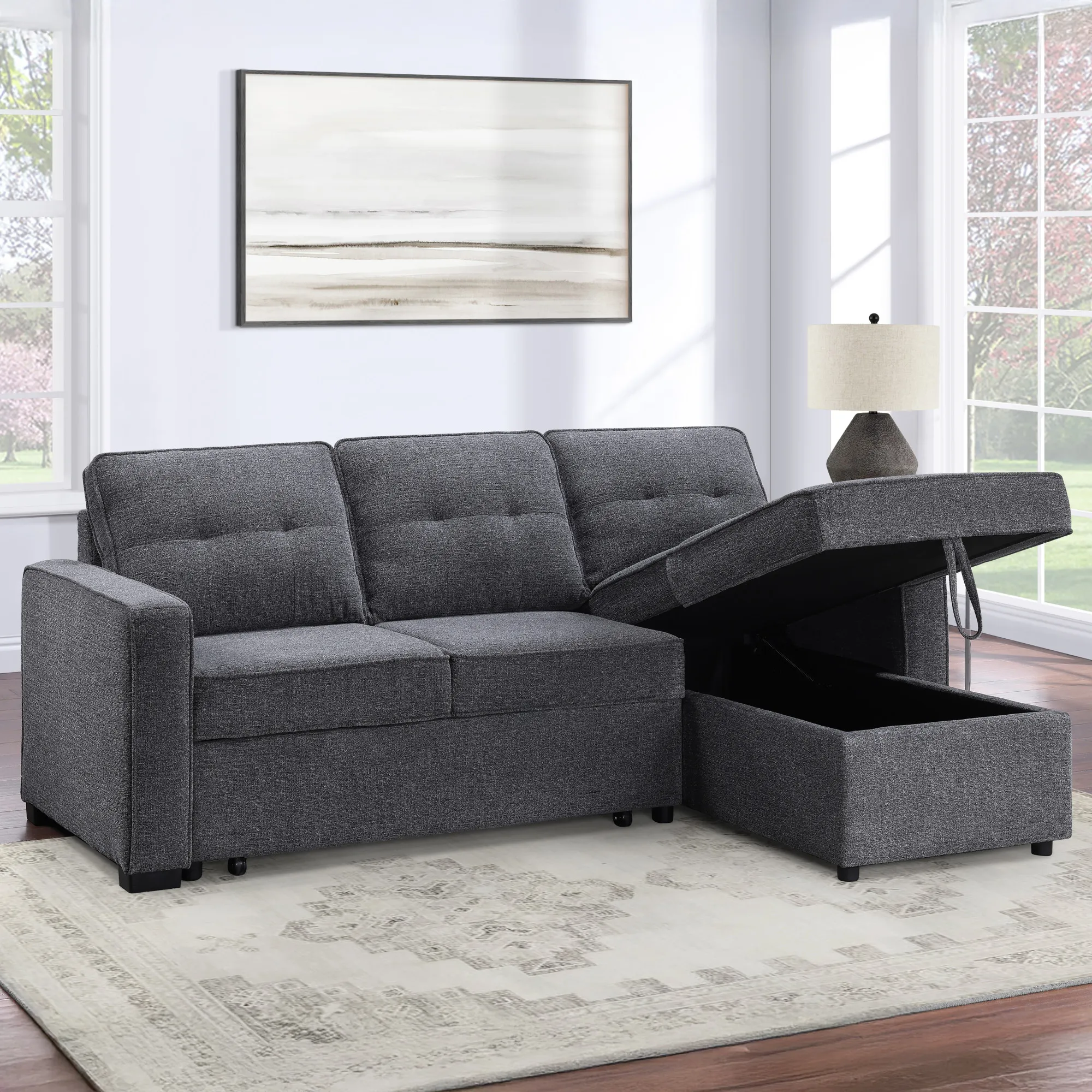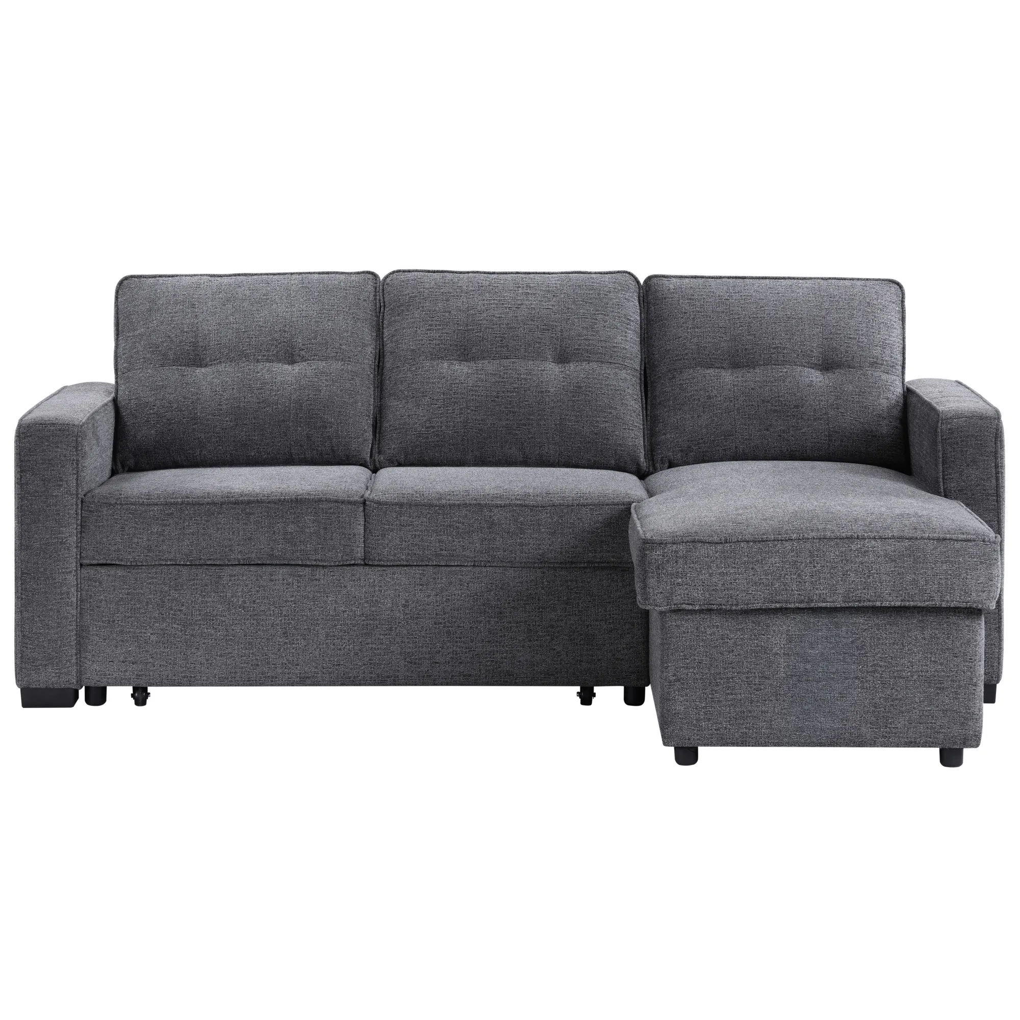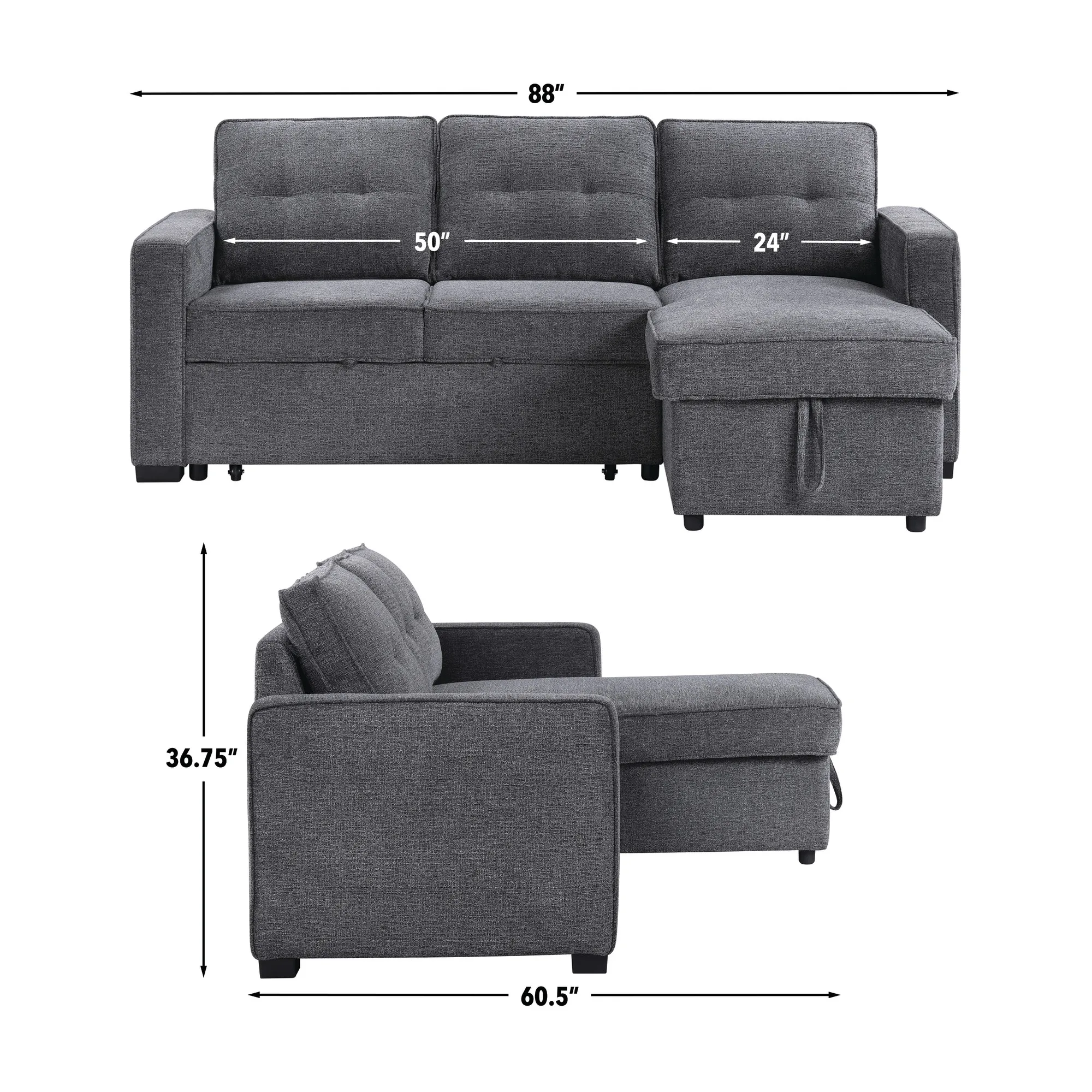 Elevate your living space with the versatile Noah Reversible Chofa. By day, it's a stylish Chofa with a chic modern design with a chaise that can be configured for the left or right side depending on your room. When night falls, the Noah effortlessly transforms into a spacious 54D x 79W sleep surface with a simple pull, providing a comfortable spot for guests or for you to unwind. The hidden storage under the chaise is perfect for keeping sleep essentials close at hand. Wrapped in a cozy gray chenille fabric, this Chofa seamlessly blends with most decors while ensuring a plush and inviting surface for both sitting and sleeping.