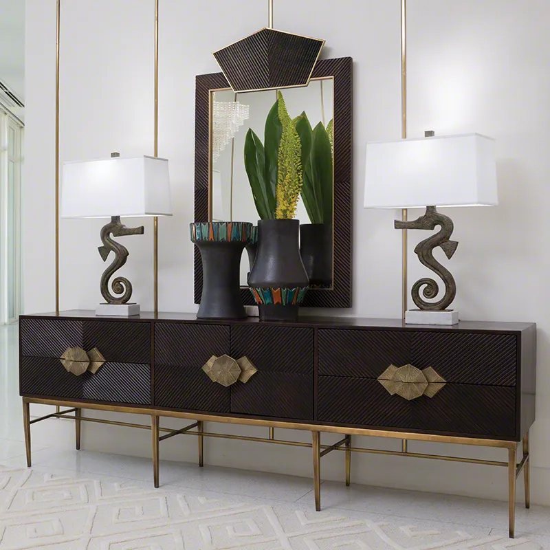 Carved dark wood set off the contrasting brass hardware inspired by the turtlebacks of the oversized species in the Galapagos island.