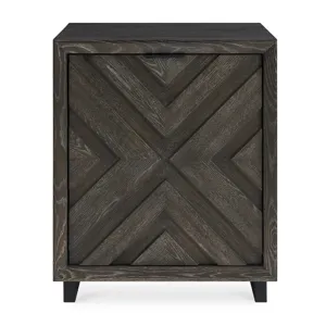 An updated blend of casual and contemporary with mirrored accents, layered with fir veneers in a geometric argyle pattern, finished in ivory and chestnut gray. Coordinating iron hardware opens to one fixed interior shelf.