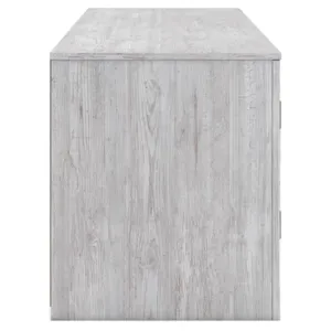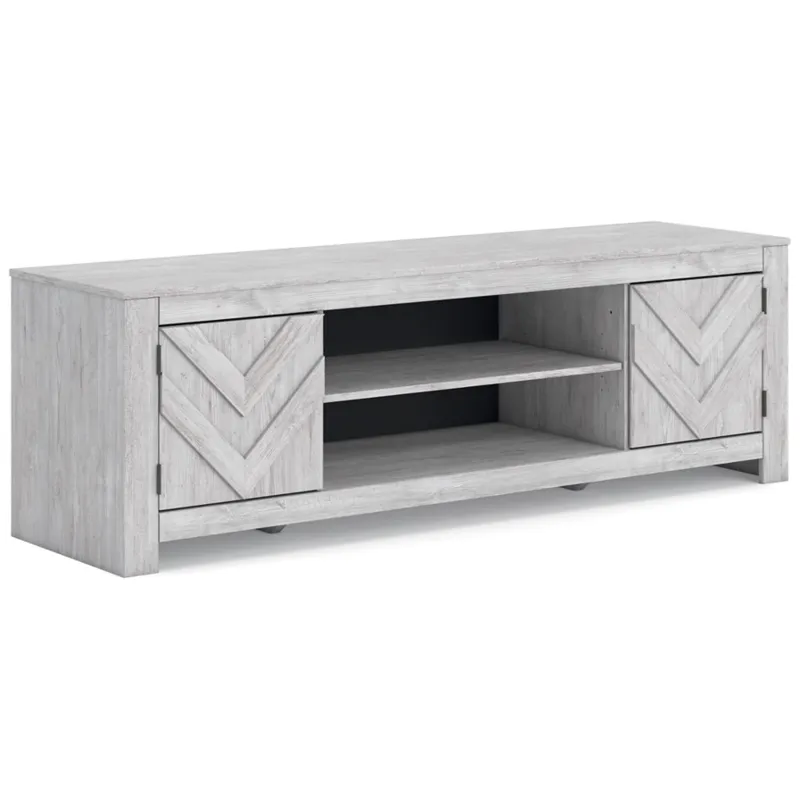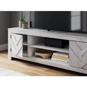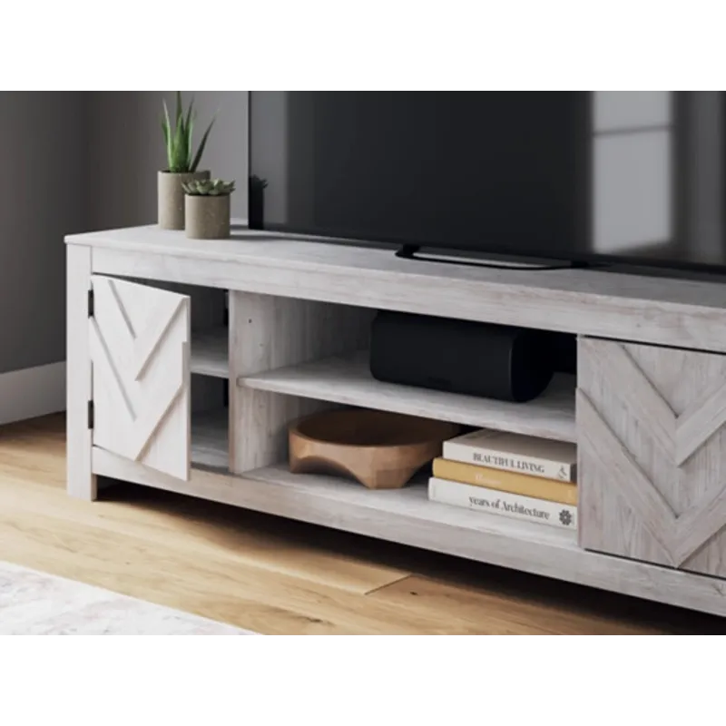 This TV stand embraces a classically charming aesthetic and repurposes it for modern living. Its whitewash replicated paint appeals to your love of vintage character, while the chic chevron pattern is effortlessly on trend. And with hidden storage behind the doors, your media accessories stay tucked away in style.